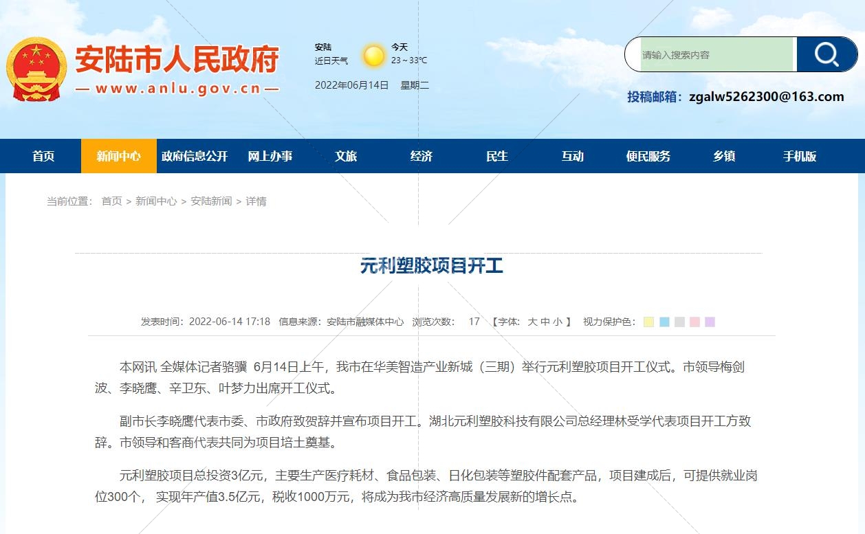 元利塑胶项目总投资3亿元,主要生产医疗耗材、食品包装、日化包装等塑胶件配套产品,项目建成后,可提供就业岗位300个, 实现年产值3.5亿元,税收1000万元,将成为我市经济高质量发展新的增长点。